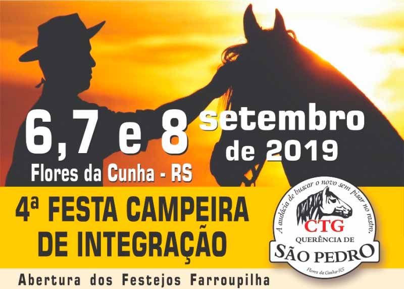 Inicia hoje (6) e segue até domingo (8), em Flores da Cunha, a 4ª Festa Campeira de Integração, no Parque de Eventos Antônio Dante Oliboni. Durante o evento vão ser disputados torneios de laço em 12 categorias, com premiações em dinheiro e troféus. A organização é do CTG Querência de São Pedro, com apoio da Prefeitura de Flores da Cunha.
