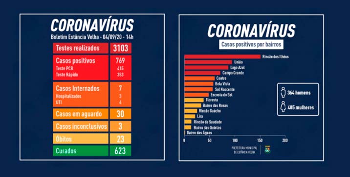 A Prefeitura de Estância Velha confirmou nesta sexta-feira (4), cinco casos do novo coronavírus (Covid-19). Do total de 769 casos positivos, 623 já estão curados.
